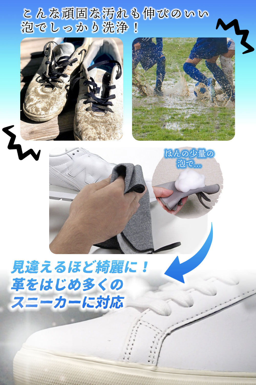 ✅【使用方法】①濡れた布や靴用ブラシでスニーカーの汚れを取ります。 ②汚れの気になる部分に泡を付けブラッシング。 ③しつこい汚れの場合は、泡を多めに塗ります。 ④水に塗れた布やタオルで泡を綺麗に拭き取ります。 ⑤靴を自然乾燥させて完成です。